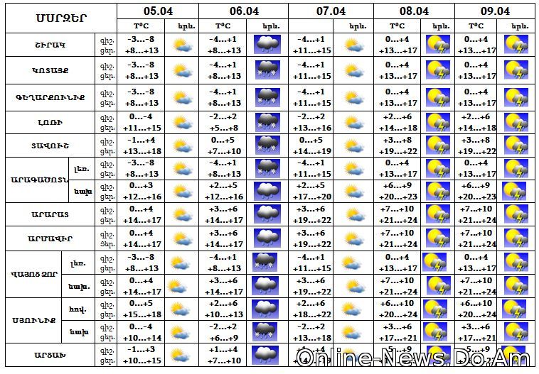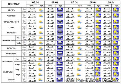 Երևանում ապրիլի 5-ին, 7-ին սպասվում է առանց տեղումների եղանակ: 6-ին, 8-9-ին օրվա երկրորդ կեսին սպասվում է կարճատև անձրև և ամպրոպ, ամպրոպի ժամանակ` քամու ուժգնացում 15-20 մ/վրկ: